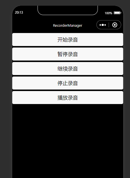 通过recorderManager.wxml中的5个按钮来调用RecorderManager录音管理器的录音、暂停、继续录音、停止录音和播放录音功能。在录制好音频之后也可以上传到服务器,本例只是把录制好的音频存放在手机临时目录,然后用来播放。