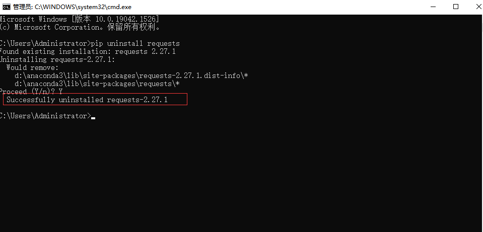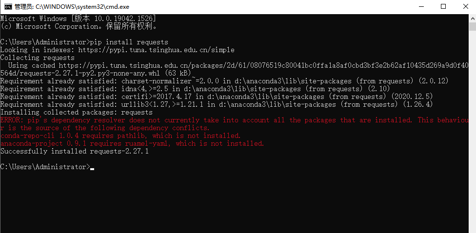 最后一句就是提示安装成功 2.27.1版本的 requests 模块了。