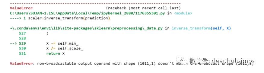 报错了,这是因为在缩放数据时,我们每行有 5 列,现在我们只有 1 列是目标列。