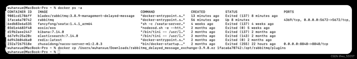 # 查看容器ID docker ps -a # 将本地文件复制到docker容器中 docker cp /Users/wuhanxue/Downloads/rabbitmq_delayed_message_exchange-3.9.0.ez 1faca6a70742:/opt/rabbitmq/plugins