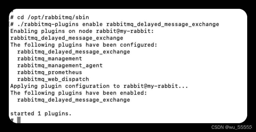 docker exec -it 1faca6a70742 /bin/bash cd /opt/rabbitmq/sbin ./rabbitmq-plugins enable rabbitmq_delayed_message_exchange