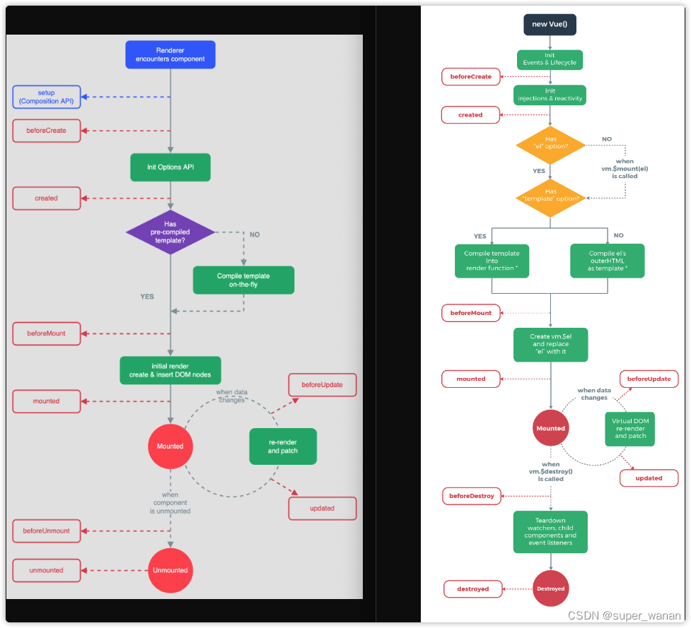 下图对比了vue3(左)和vue2(右)的生命周期:vue3将destoryed该名成了unmounted,相应的beforeDestory改成了beforeUnmounted。除此之外在组合式API中新增了个钩子函数:setup。它发生在beforeCreate之前。