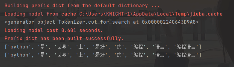 import jieba sentence = 'python是世界上最好的编程语言' ls3 = jieba.cut_for_search(sentence) print(ls3) # <generator object Tokenizer.cut_for_search at 0x00000199C7A3D9A8> print(list(ls3)) # ['python', '是', '世界', '上', '最好', '的', '编程', '语言', '编程语言'] ls4 = jieba.lcut_for_search(sentence) print(ls4) # ['python', '是', '世界', '上', '最好', '的', '编程', '语言', '编程语言']