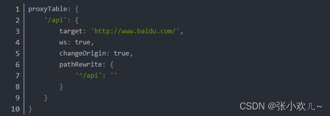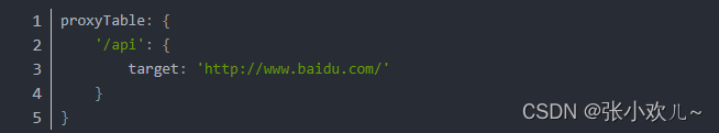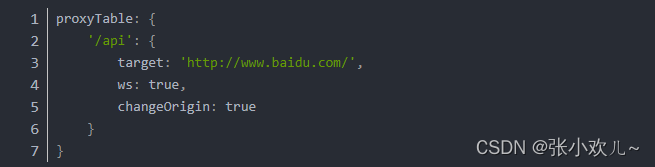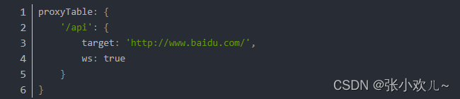 ①首先代理标志名,必须与请求路径中头部一致,示例代码如下:proxyTable:{ '/api' : { } }