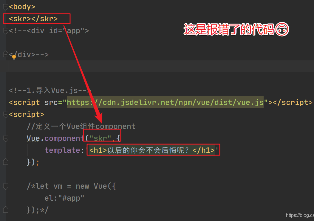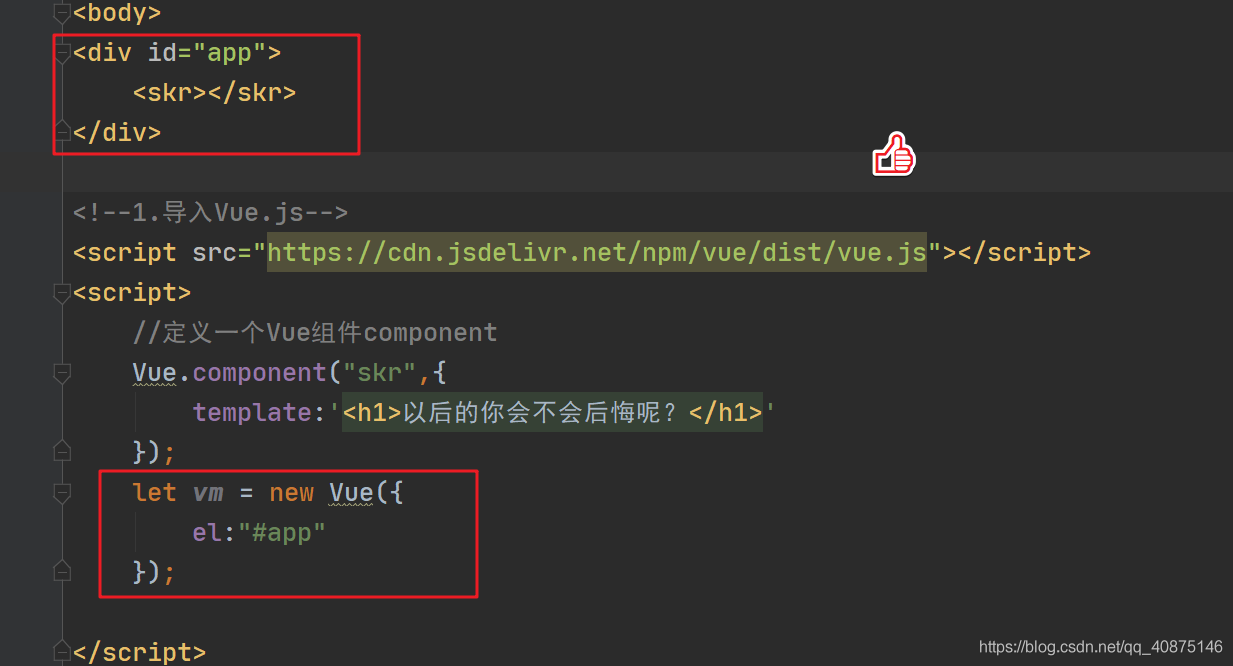 原来我们需要先声明一个Vue的实例,以及把我们自定义的组件放在标签里面。