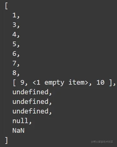 let array = [1, 3, [4, 5], [6, [7, 8, [9, , 10]]], [, ,], [undefined, null, NaN]];