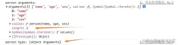 console.log("person type:", Object.prototype.toString.call(arguments));
