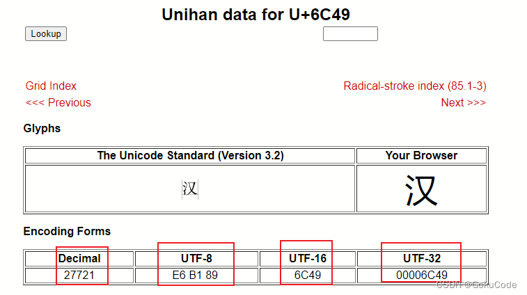 Unicode也叫万国码、单一码,是计算机科学领域里的一项业界标准,包括字符集、编码方案等。对于世界上所有的语言文字再unicode中都可以查看到。【汉】字的编码解释官网https://www.unicode.org/cgi-bin/GetUnihanData.pl?codepoint=6C49