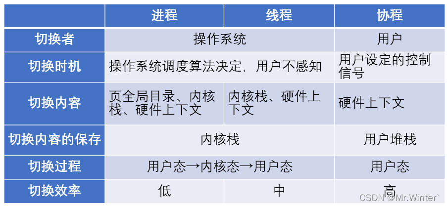 看了这么多概念可能有点晕了,下面这张表总结了本文的内容。总得来说,进程、线程、协程各有各的应用场景,不能说多进程、多线程、多协程就一定好,而是要根据具体的使用情况来确定。