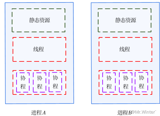 这张图说明了什么?首先,一条线程是进程中一个单一的顺序控制流,一个进程可以并发多个线程执行不同任务。协程由单一线程内部发出控制信号进行调度,而非受到操作系统管理,因此协程没有切换开销和同步锁机制,具有极高的执行效率。