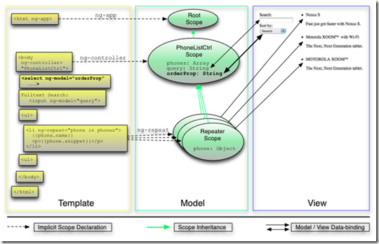 AngularJS的scopes就是一般的JavaScript对象,在它上面你可以绑定你喜欢的属性和其他对象,然而,它们同时也被添加了一些功能用于观察数据结构上的变化。这些观察的功能都由dirty-checking来实现并且都在一个digest循环中被执行。