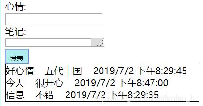 心情:<br/> <input type="text" id="mood"/><br/> 笔记:<br/> <textarea id="network"></textarea><br/> <button id="send">发表</button> <div class="ban"></div>