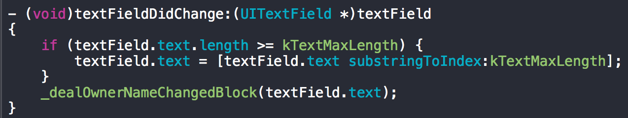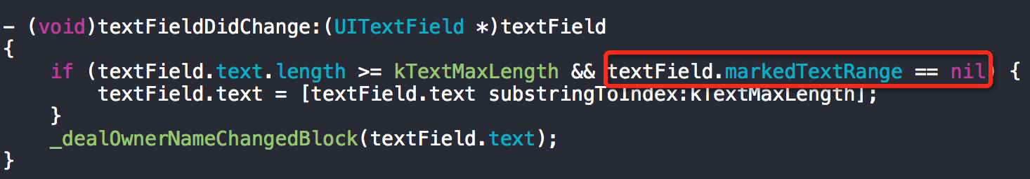 但对于系统键盘,联想状态下的输入也会监听,这里如果不处理就容易发生崩溃,例如当快要达到字数限制时,继续输入,此时textField.text =联想输入文字 textField已有文字,当textField.text超过字数限制时,就会截取限长部分赋值给textField.text,但这时输入数据还没提交,textField.text不允许改变,于是冲突产生,继而导致崩溃。在iOS8、9没有崩溃的原因估计是系统做了优化处理,达到字数限制时,自动将限制范围内的联想文字确定输入到textField中。