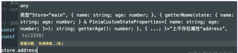 可以看到我们使用store的时候,它的所有属性和方法state、getters、actions等都会自动提示出来,并且当我们使用了不存在的属性在编码期间会直接报错。
