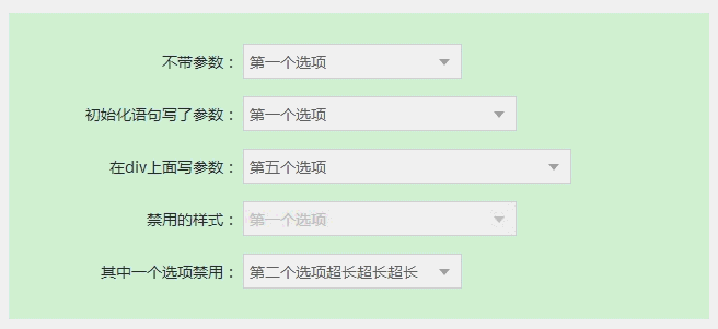 disabled: true, //一:这里的参数写disabled:true 二:给div加class="disabled" 三:给原生select加disabled="true"