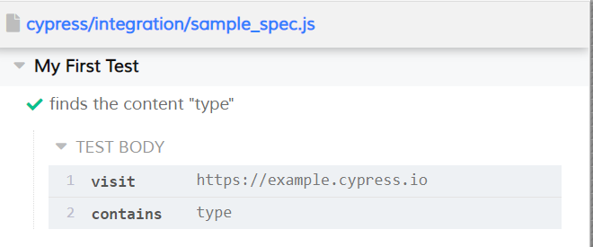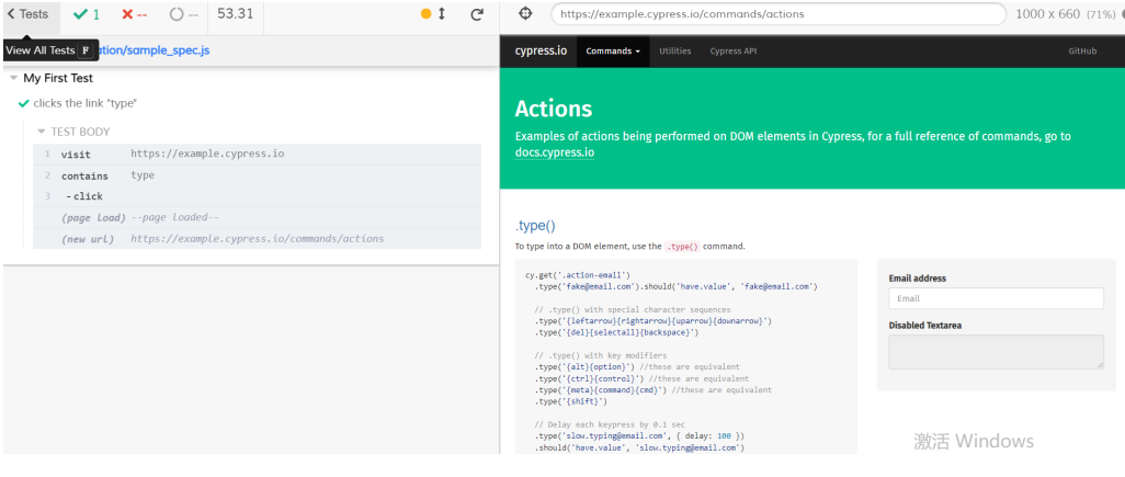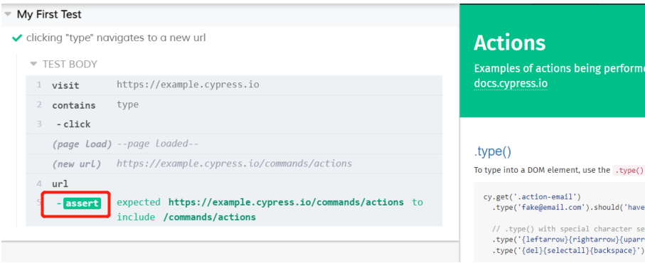 另外,从cy.contains('type').click()这行代码可以看出,在cypress里可以采用链式调用的方式,更直观的描述出要做的事情。