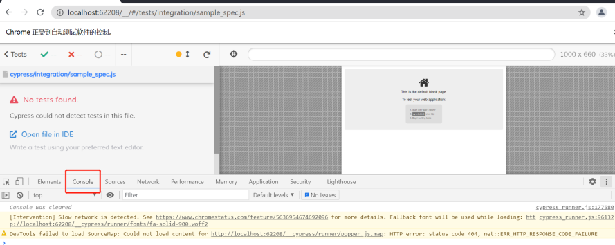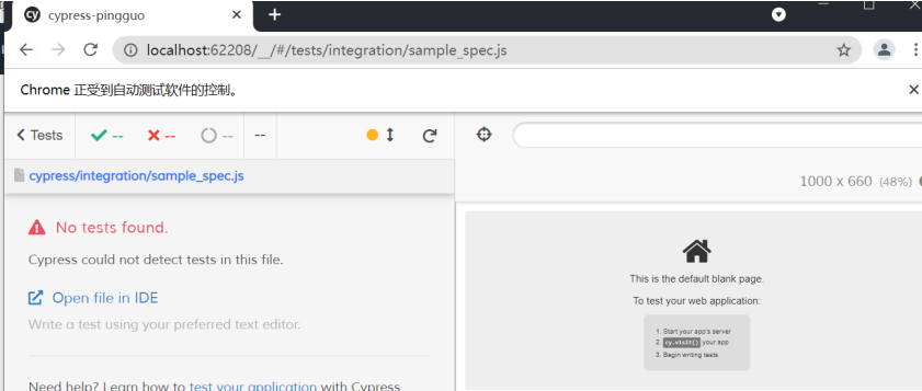 显示No tests found,这是正常情况,因为我确实啥也没写。不过有时候cypress在解析测试文件内容的时候也会有这种报错提示,可以F12打开开发者工具,查看console里是不是有错误消息。