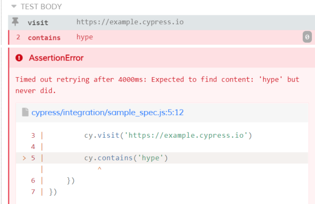 可以试试,用页面上没有的东西替换type,比如hype。测试就变红了,但是需要4秒。为什么要等4s,因为cypress它会自动等待并重新尝试,不会立即失效!