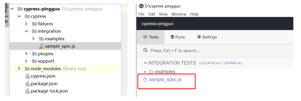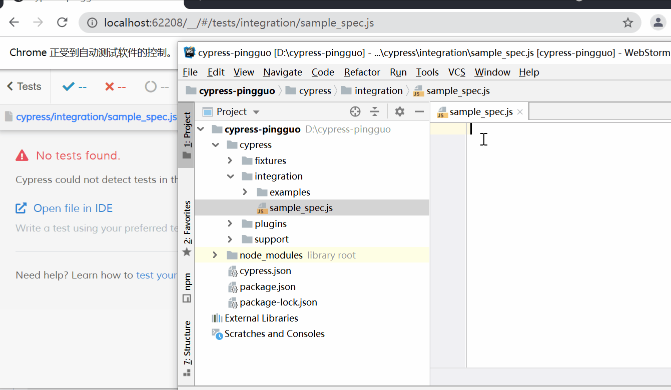 在你的项目下的cypress/integration文件夹中创建一个新文件sample_spec.js,我这里直接在webstorm编辑器中创建。
