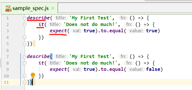 在编辑器里查看测试文件,很容易看到在代码里,describe, it, 和 expect这3个是关键字。