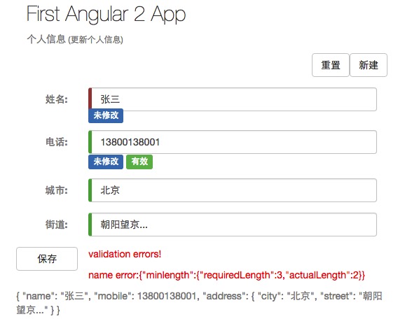 <input type="text" name="name" [(ngModel)]="user.name" #name="ngModel" required minlength="3"> <span *ngIf="name.pristine" class="label label-primary">未修改</span> <span *ngIf="name.dirty" class="label label-warning">已修改</span> <span *ngIf="name.valid" class="label label-success">有效</span> <div [hidden]="name.valid || name.pristine" class="alert alert-danger"> <p *ngIf="name.errors?.minlength">姓名最小长度为3</p> <p *ngIf="name.errors?.required">必须输入姓名</p> </div>