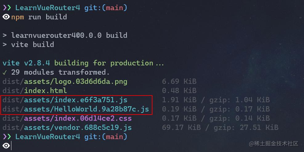 component: () => import('./components/HelloWorld.vue')然后打包(webpack、Vite)工具就会将这些动态导入的组件单独打包,如下图所示: