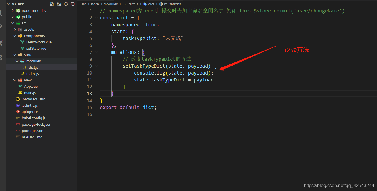 //   因为我们在modules下开启了命名空间,所以我们在调用dict下的Mutations时,需在前方加上空间名字