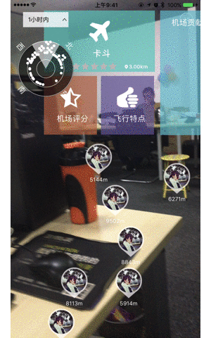 4、通过计算角度区间来显示手机上的物体显示还隐藏,也就是说在雷达图上的点进入扇形可见的区域就显示出物体并且移动,超出就隐藏起来。还有一点,就是要算碰撞检测的手机上物体与物体如果太多,就不能叠在一起,通过错位错开来,可以通过CGRectIntersectsRect来写个算法检测两个矩形是否碰到了。