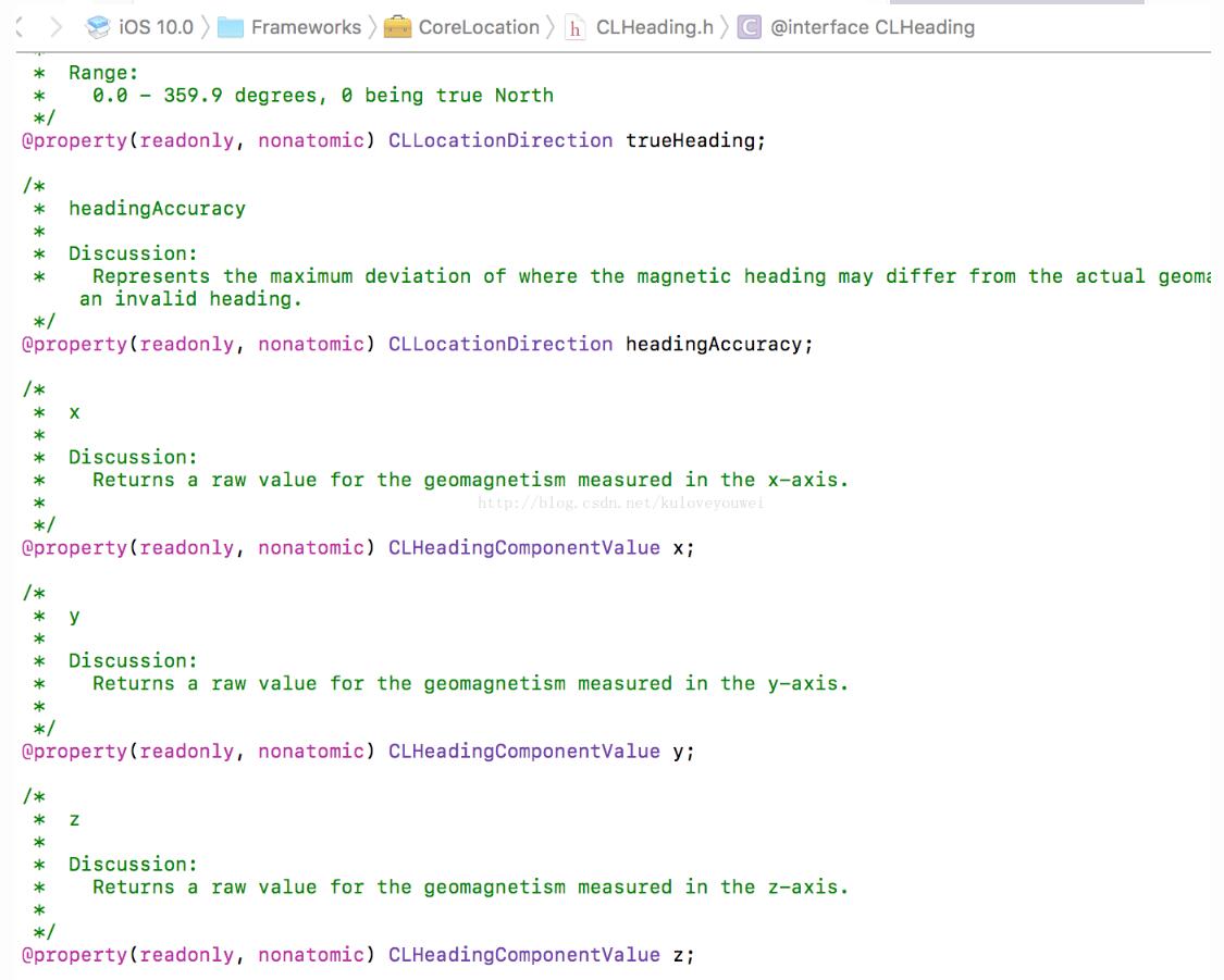 3、要实现雷达图跟随手机旋转而转动,这里我们要用到指南针的原理,通过CLLocationManager管理类,里面有个CLHeading类,我们可以实现指南针,看这个类的结构: