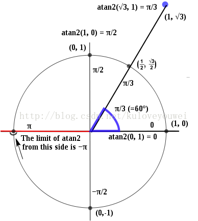 这个维基上的一张方位角的解释图,我们可以同通过tan2函数来计算,公式如下: