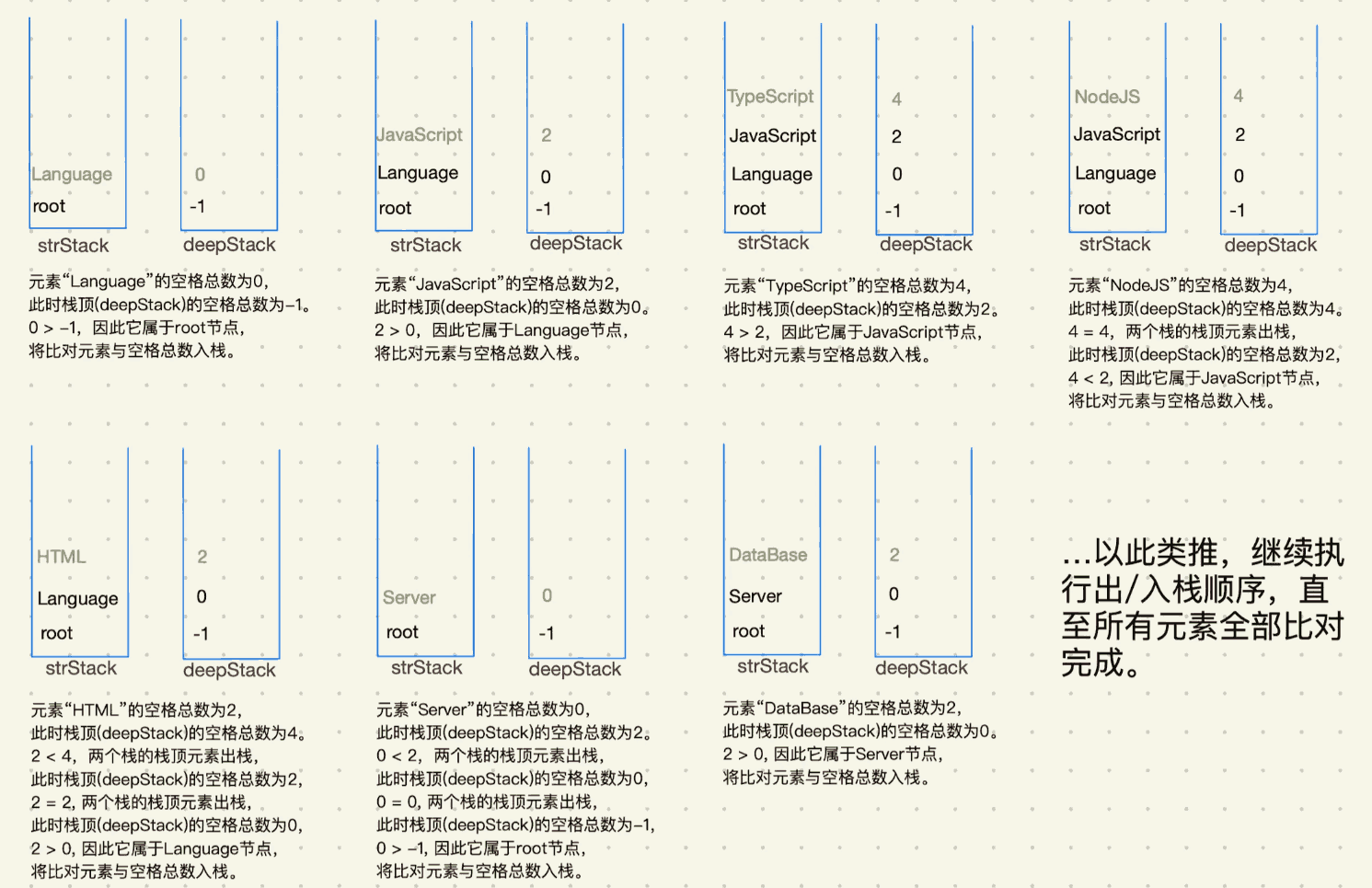注意:为了让读者更直观的看出规律,strStack栈中的元素用字符串直接代替了,实际上栈中存储的数据是一个对象,该对象包含了name属性和children属性。当前入栈元素也会构造成一个对象,得出栈顶元素(deepStack)与入栈元素空格总数的比对结果后,会将入栈元素对象放进栈顶元素(strStack)的children中。