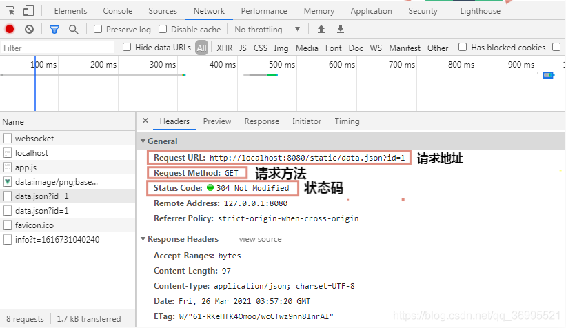 Status Code:304 Not Modified---304是重定向;正常情况下,第一次访问接口的时候返回的 都是200;当你第二次访问接口的时候,如果数据没有变化, 那么浏览器会自动识别返回一个状态304,代表数据没有更改 、重定向;相当于重定向到你刚刚访问的资源,这样的话会加载 更快!