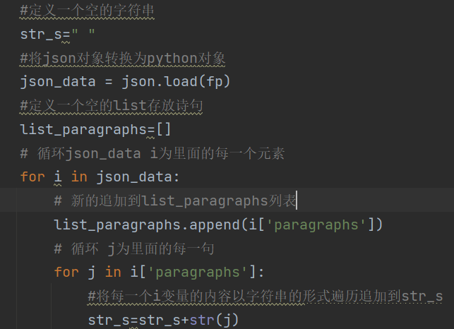 - 定义一个空的字符串,将json对象转换为python对象。定义一个空的list存放诗句。