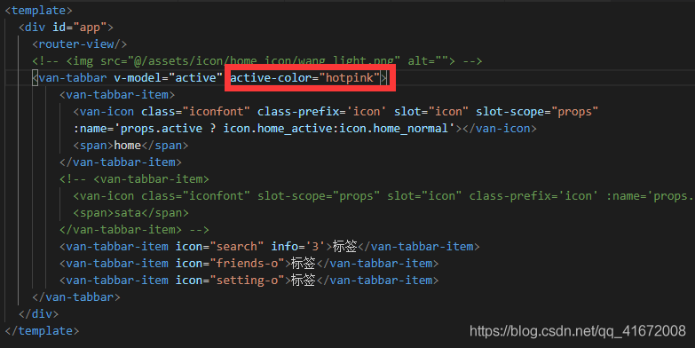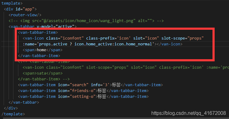 <van-tabbar-item> <van-icon class="iconfont" class-prefix='icon' slot="icon" slot-scope="props" :name='props.active ? icon.home_active:icon.home_normal'></van-icon> <span>home</span> </van-tabbar-item>