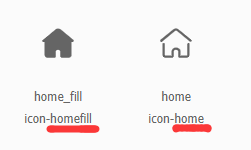 可以看见iconfont矢量图的名称就是home 和 homefill,这可不是我随便取的,要看看你想调用的iconfont图标名称是啥