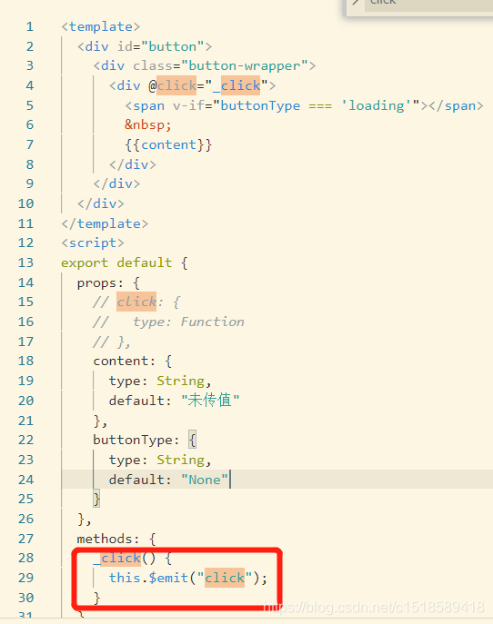 被调用组件写法:将click绑定在自定义组件内部想要click的地方