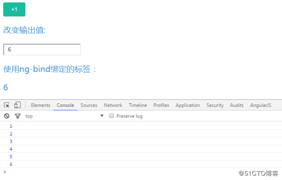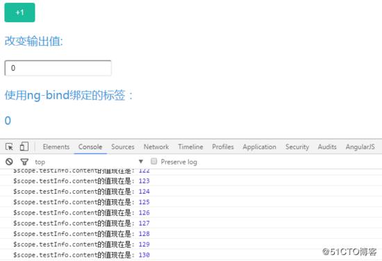 demo中,每次点击 1 按钮, $scope.testInfo.content 的值会增加1,我们可以看到页面上的结果: