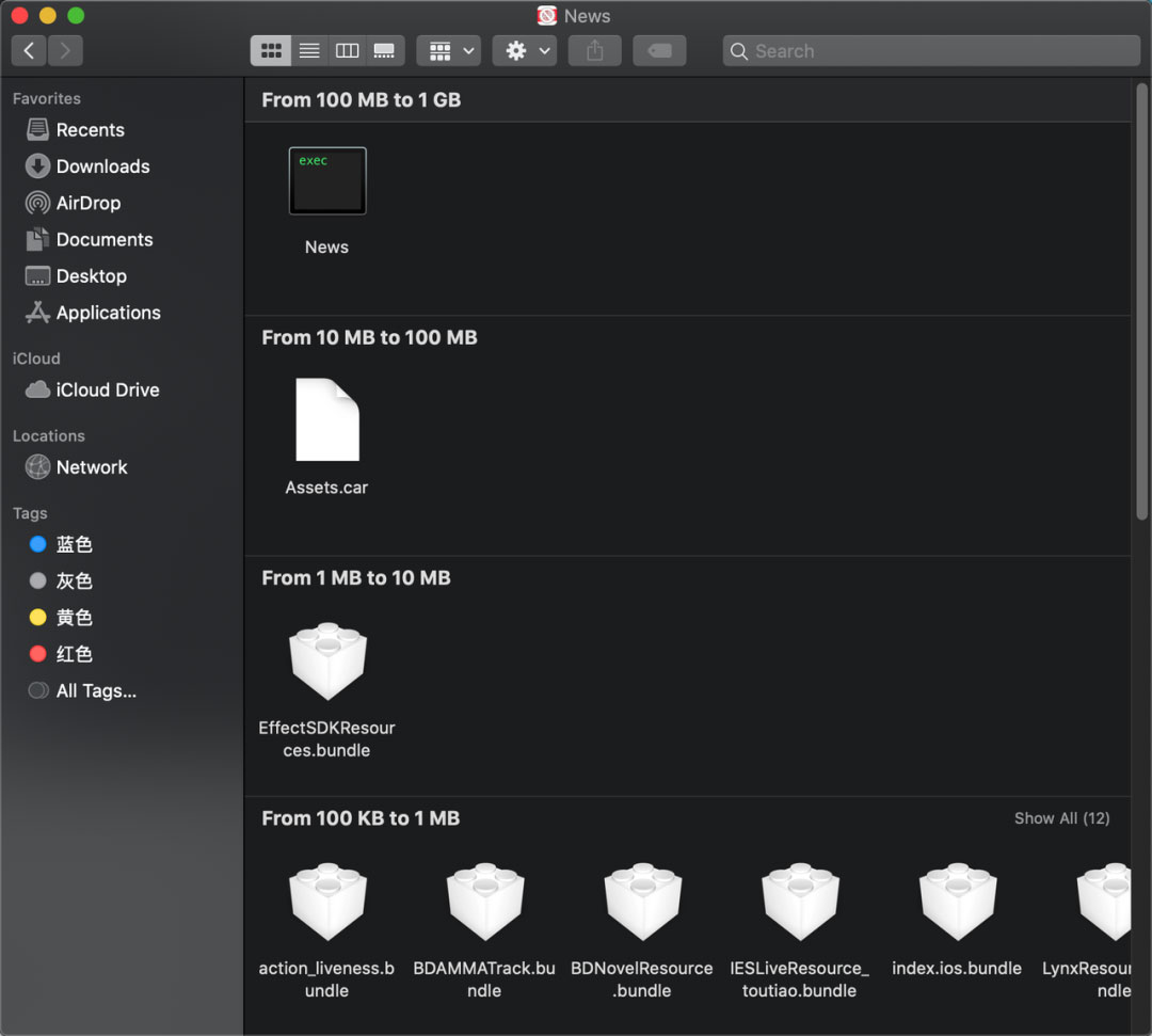 当我们通过构建,获得了一个经过了 App Slicing 后的 ipa 文件后,将其用 zip 解压缩方式解压,进入 .app 文件后,我们就可以直观地看到安装包中的内容。