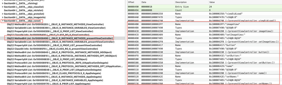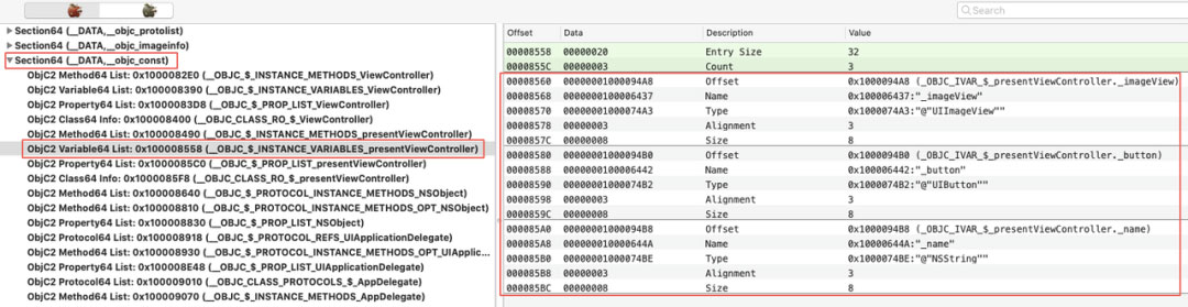 (2)自动生成的 set/get 方法部分:set/get 方法本质是一个大小 24B 的结构体,结构体包含三个指针 Name、Type、Implementation,指向的内容大小大概为 10B、10B、20B。一个方法大小大概是64B,set、get 两个方法就是 128B。