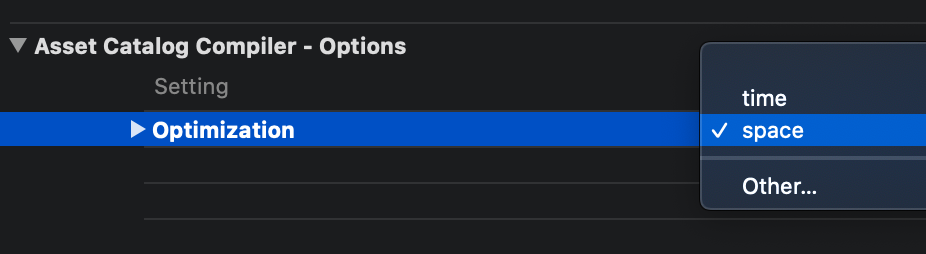 2、开启 Pod 库和主工程 Xcode Build Settings 中的 ASSETCATALOG_COMPILER_OPTIMIZATION space 选项