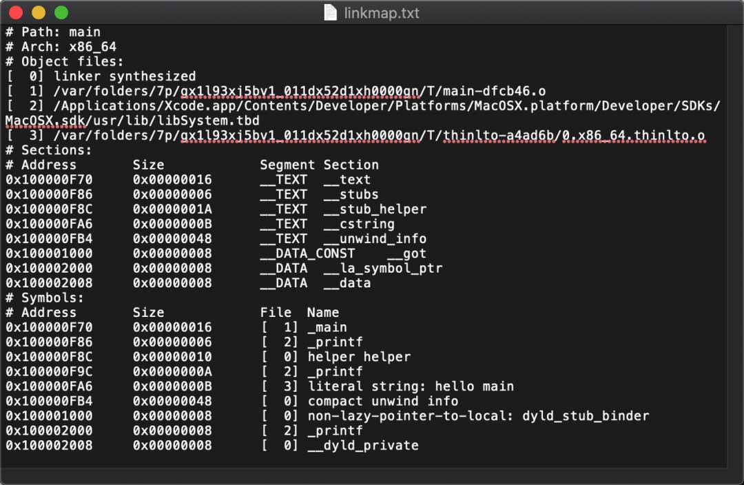 在 Build Settings 中打开 LD_GENERATE_MAP_FILE 开关,构建 App 的过程中就会生成一个名叫 Link Map 的 txt 文件,它能展示每个段、每个节、每个函数在 Mach-O 中的分布和大小。这些信息是包大小优化中经常使用的。