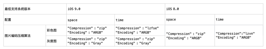 这两项设置可以改变 actool 构建 Assets.car 时选取的编码压缩算法,减小包大小。我们可以使用 xcrun assetutil --info Assets.car 命令检查 Assets.car 中每张图片使用的编码压缩算法。在今日头条环境下,整理的结果如下: