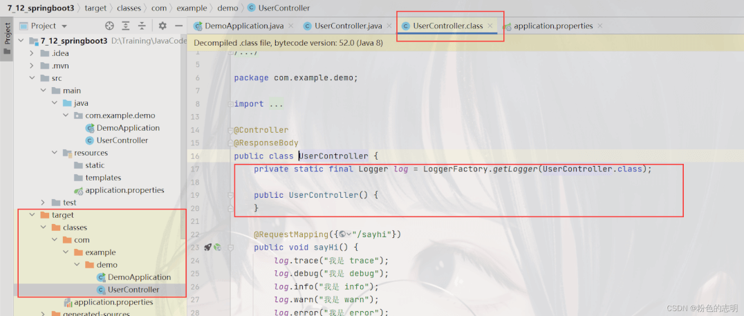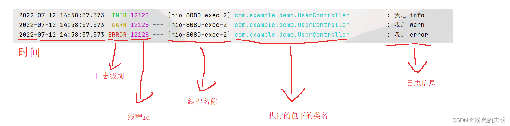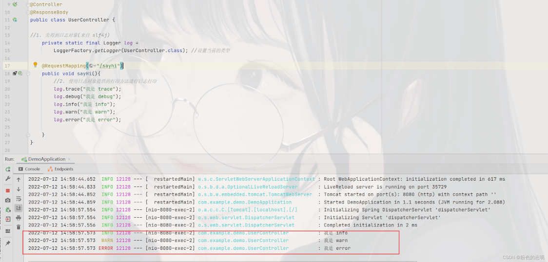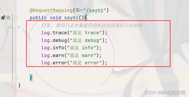 在一个类中先获得打印日志对象(日志框架提供的日志对象,而日志框架默认已经集成到 SpringBoot 里了)使用日志对象提供的方法实现日志的打印