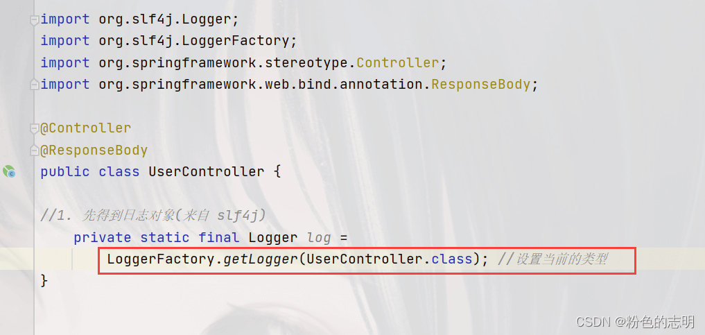 // LoggerFactory.getLogger(UserController.class); //设置当前的类型