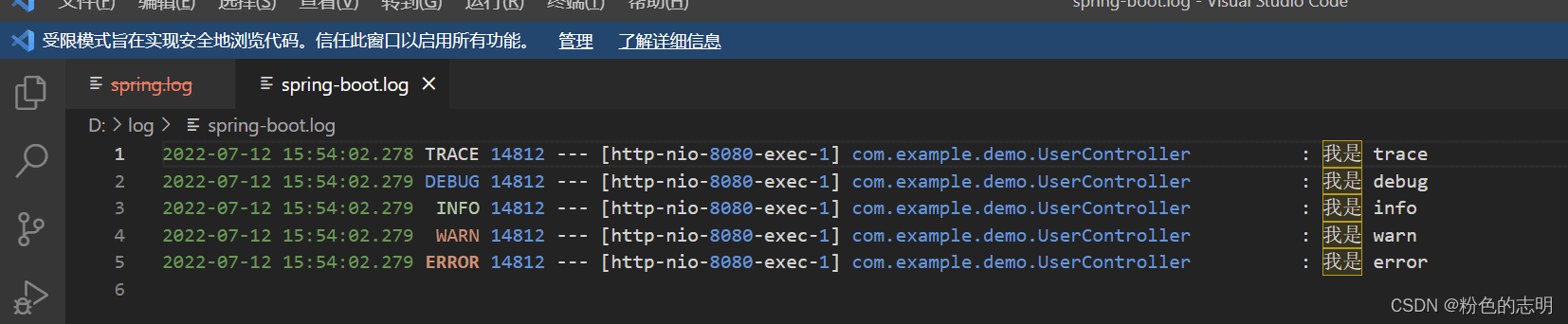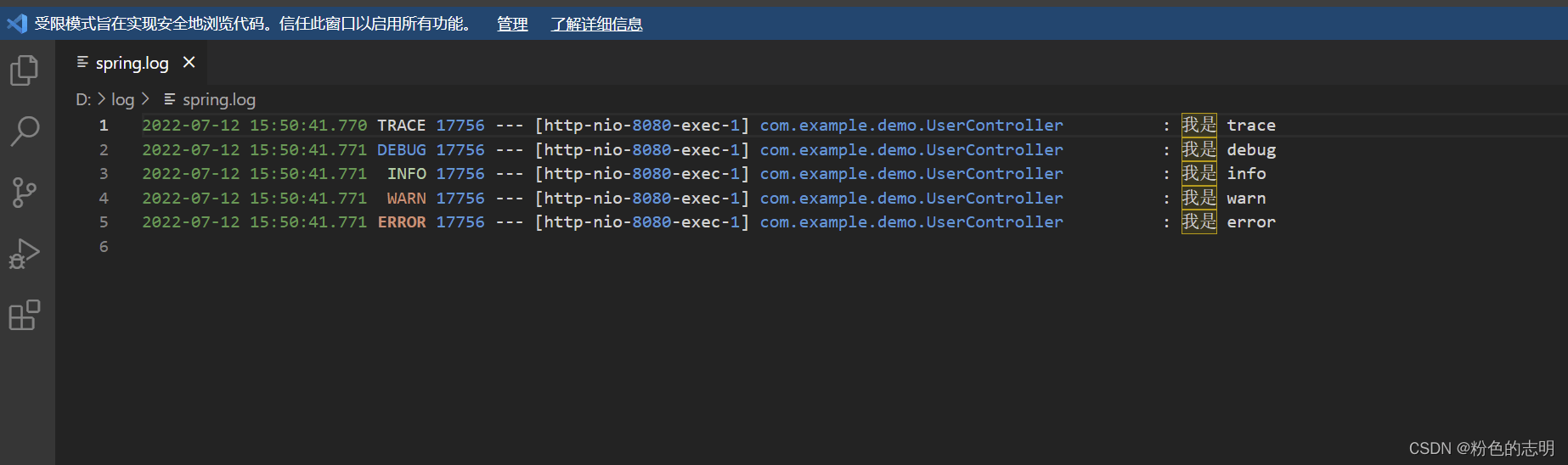 以上的⽇志都是输出在控制台上的,然⽽在⽣产环境上咱们需要将⽇志保存下来,以便出现问题之后追溯问题,把⽇志保存下来的过程就叫做持久化。