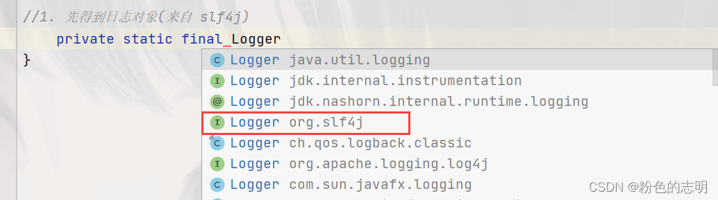 得到日志对象 Logger ,它来自于 slf4j,不要导错了包,在程序中获取⽇志对象需要使⽤⽇志⼯⼚ LoggerFactory