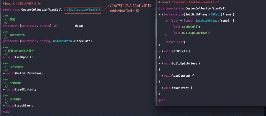 2.注意:你所创建的cell要继承CustomCollectionViewCell.然后你的cell上实现他所继承的类的几个方法,并创建你想要的界面.