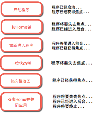 # 程序第一次启动后才会执行 - (BOOL)application:(UIApplication *)application didFinishLaunchingWithOptions:(NSDictionary *)launchOptions; # 程序将要失去焦点时执行 - (void)applicationWillResignActive:(UIApplication *)application; # 程序得到焦点时调用 - (void)applicationDidBecomeActive:(UIApplication *)application; # 程序进入后台执行 - (void)applicationDidEnterBackground:(UIApplication *)application; # 程序进入前台执行 - (void)applicationDidEnterForeground:(UIApplication *)application; # 程序即将退出时调用 - (void)applicationWillTerminate:(UIApplication *)application; # 程序发生内存警告的时候调用 - (void)applicationDidReceiveMemoryWarning:(UIApplication *)application;