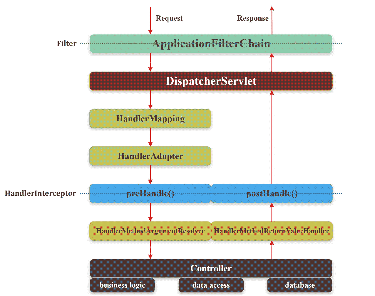 一切 Java 程序都是基于 Thread 的,当一个 HTTP 请求到达后,Servlet Container 会从其线程池中捞出一个线程来处理该 HTTP 请求。具体地,该 HTTP 请求首先到达 Servlet Container 的FilterChain中;然后,FilterChain 将该 HTTP 请求委派给DispatcherServlet处理,而 DispatcherServlet 恰恰就是 Spring MVC 的门户。在 Spring MVC 中,所有 HTTP 请求都由 DispatcherServlet 进行路由分发。大致流程下图所示。