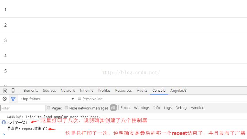 有时候需要在ng-repeat 指令repeat结束之后进行一些操作时便可以使用这种方法。